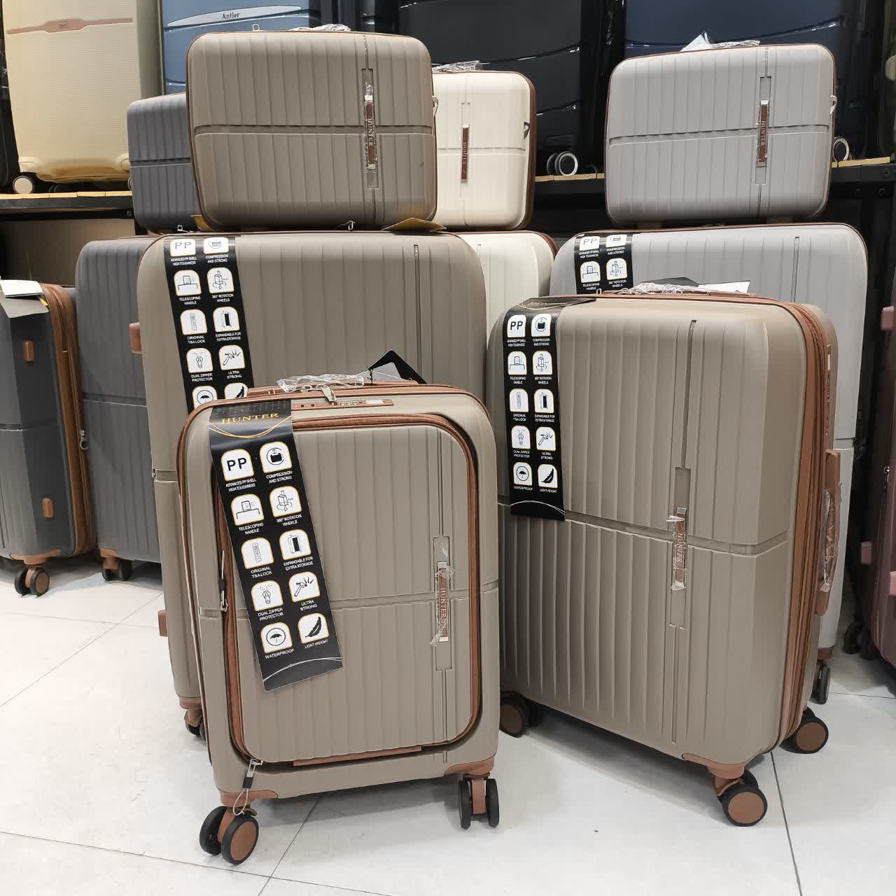 چمدان هانتر رنگ بژ با حاشیه شکلاتی